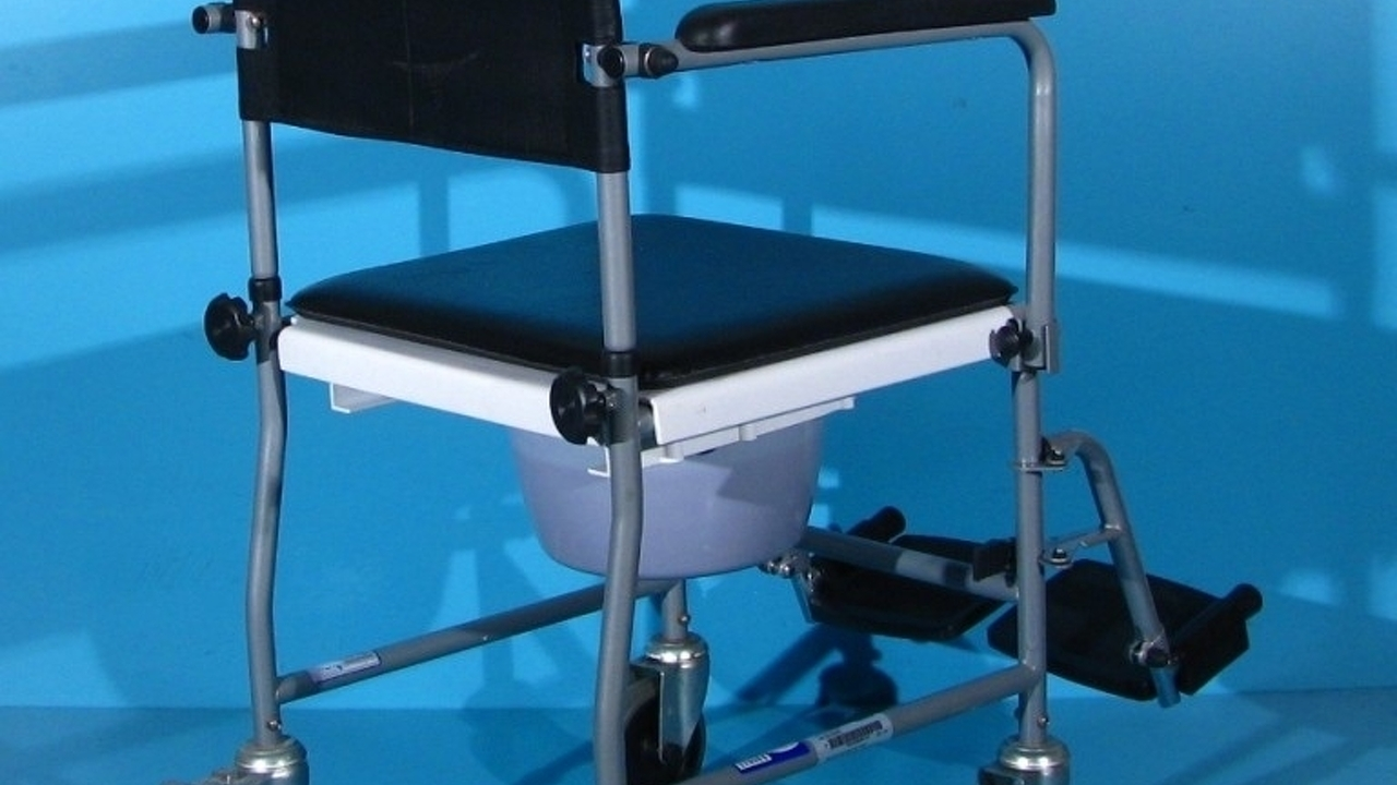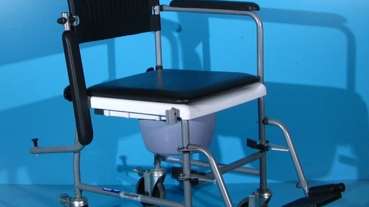 Scaun handicap cu wc (toaleta), cu rotile destinat persoanelor cu nevoi speciale.